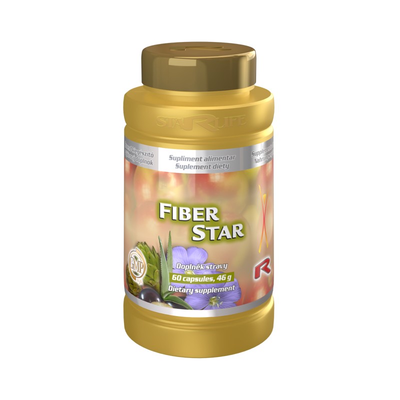 Fiber Star je rastlinný doplnok vlákniny, ktorého obsiahnuté látky majú vynikajúce väzobné vlastnosti. Obsahuje známe liečivky: ľan úžitkový, skorocel blškový, plody slivky domácej, artičoku bodliakovú, ibiš lekársky, horec žltý, kôru z brestu, echinaceu purpurovú, aloe vera, lucernu a kajenské korenie. Najmä Plantago ovata- Psylium Husk -skorocel blškový - podporuje zdravé trávenie a črevné funkcie. Uľahčuje črevný tranzit a pomáha udržiavať zdravé črevá. Je vhodný v tehotenstve a pri ťažkostiach so žilovou pleteninou v konečníku (hemoroidy), kedy vhodne predchádza príležitostnej zápche. Produkt FIBER STAR je účinným doplnkom redukčných programov.